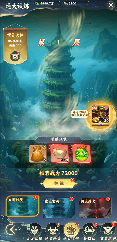 玩家完成激活坐騎任務后開啟太南秘境副本,通過主線300關后開啟虛天玄關副本,最后一個副本為闐天烽火。每爬一層塔都會獲得獎勵,每過一定層數都會獲得額外的大獎。