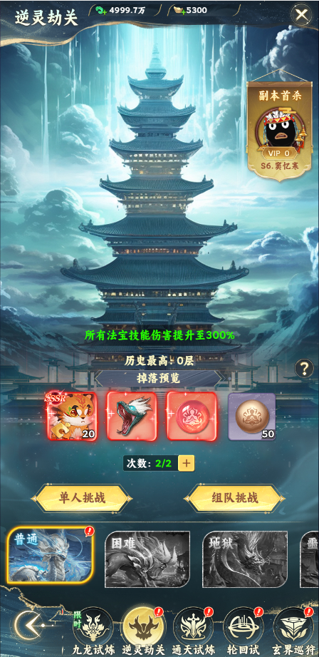 通關主線200關開啟逆靈劫關。玩家擁有兩次收益次數,通關副本會消耗收益次數獲取豐厚獎勵。逆靈劫關可以組隊也可以單人挑戰,最多支持3人組隊,副本有多種難度,難度越高收益越高,副本限時戰斗,在限時內通關當前難度后開啟下一個難度。戰斗中,隊友戰斗失敗可使用技能復活隊友,當場上玩家全部陣亡,戰斗立即結束并結算獎勵。戰斗中玩家可以消耗仙玉釋放副本技能提升傷害,技能效果全隊共享,重復釋放技能效果不疊加