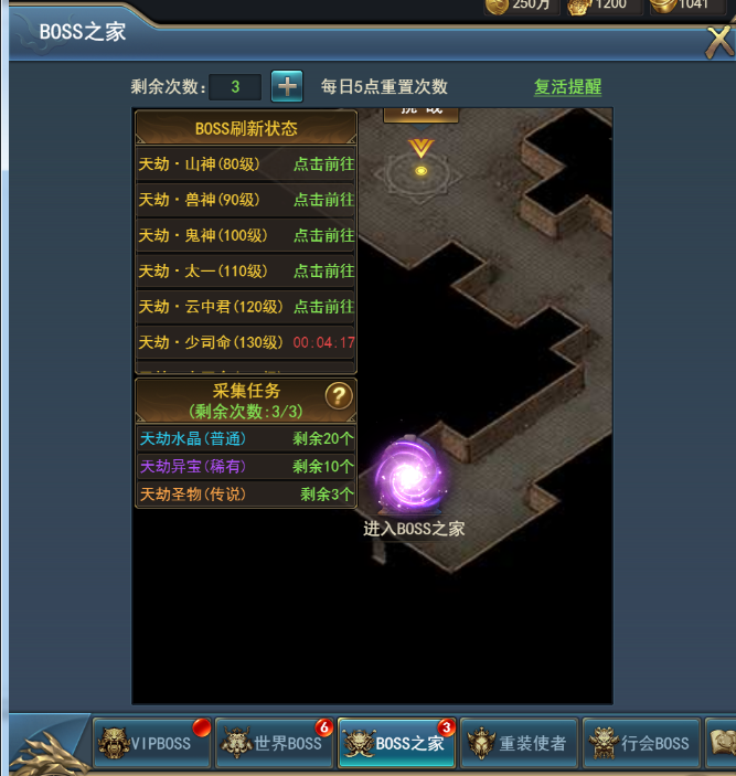 BOSS之家為一個獨立的玩法地圖,場景中有多個不同等級的BOSS房間入口,以及在隨機位置定時刷新的三種采集物。