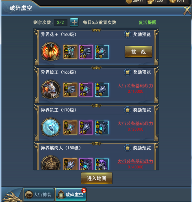 破碎虛空的玩法與“BOSS之家”接近,為一個獨立的玩法地圖,場景中有多個不同等級的BOSS房間入口。