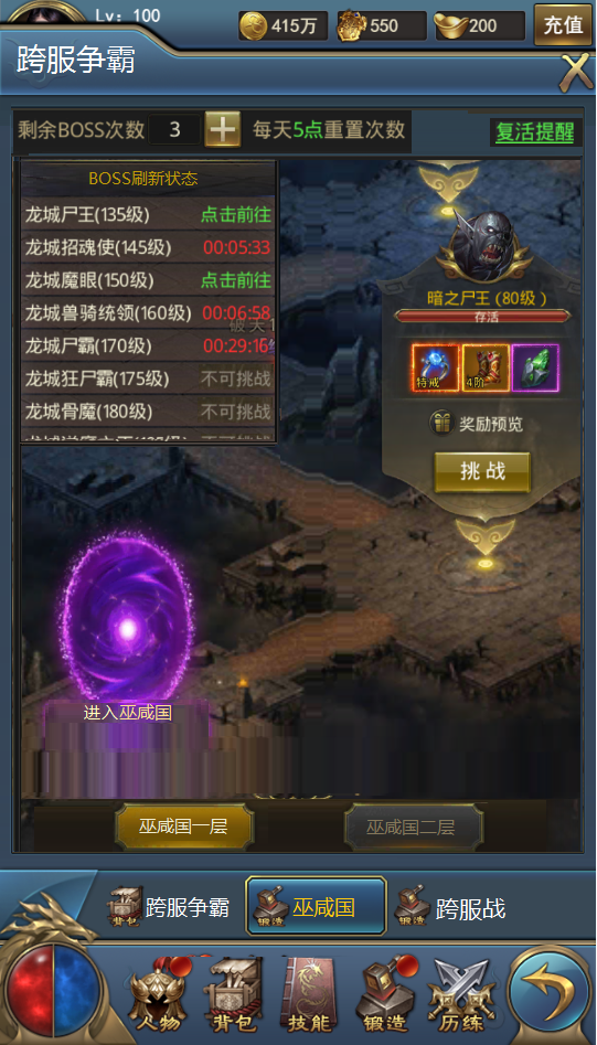巫咸國是一個跨服玩法,多個服務器的玩家將在同一個場景中競爭BOSS歸屬。巫咸國為一個獨立的玩法地圖,場景中有多個不同等級的BOSS房間入口。