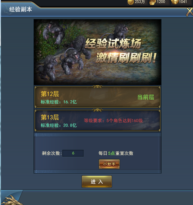 經驗副本從主城NPC處進入。當角色達到一定等級條件時會自動解鎖更高的副本層數。