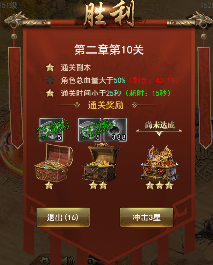 戰斗勝利后將根據本場的表現決定通關星級,若達到三星即可獲得所有獎勵,并解鎖下一關的挑戰資格。