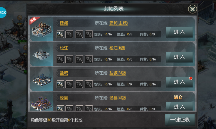封地是在世界上面的城池上面封的,城池等級越高對封地建筑的提升越高。封地每五級開啟一個新的封地。封地建筑分為兵營,農田,木廠,銅礦廠四種,分別對應練兵,糧食,木頭與銅錢。農場,木廠,銅礦建筑等級越高產量與儲存上線越高。建筑等級越高和產出的數量成正比。