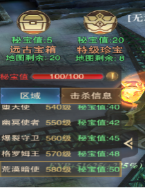 該BOSS玩法的進入副本后也是擁有100點秘寶值,也是該游戲魂器以及魂器材料產出的唯一途徑,激活魂器能給與角色很大的屬性加成,建議開啟該玩法后,每天都把次數刷完! 除BOSS以外,還有遠古寶箱和特級珍寶可供玩家采集,但采集寶箱也同樣需要消耗秘寶值,詳情可見下圖。且該副本的BOSS挑戰難度較高,擊殺會比較耗時。(PS:按照物品掉落的稀有程度,優先級可以分為:副本BOSS≥特級珍寶>遠古寶箱)