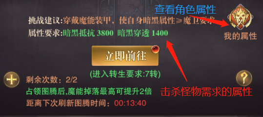 要擊殺副本中的怪物,需要滿足副本怪物的屬性要求,否則會被副本中的怪物“秒殺”。所以我們挑戰副本需要根據副本頁面右側的“我的屬性”一欄,查看角色的屬性值,來挑選副本中合適的怪物進行擊殺,待滿足了下一層怪物的屬性要求后,再進行前往挑戰。層數越高的怪物,屬性要求會越高?