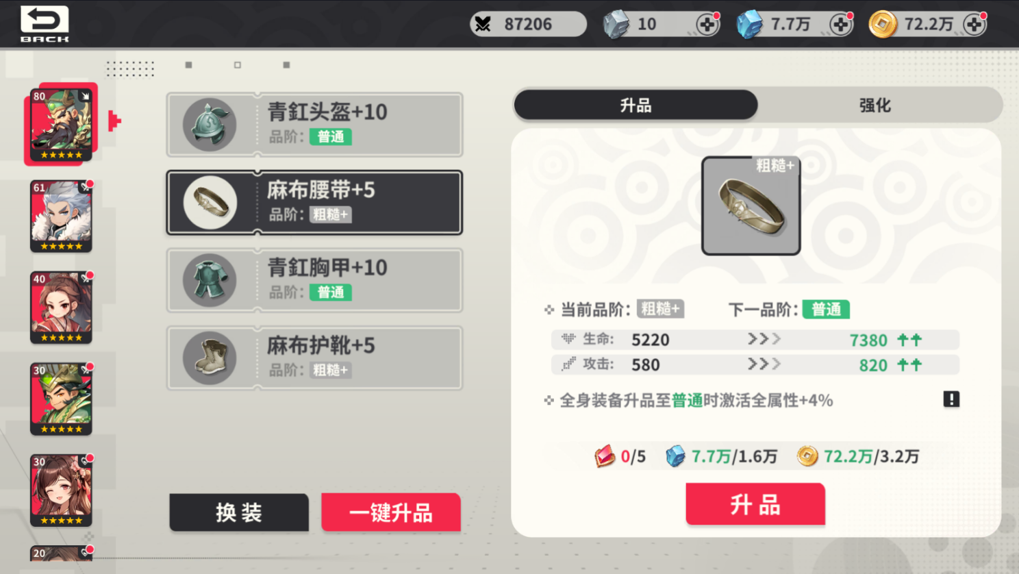 玩家可以通過掛機、古城商店購買等方式獲得裝備,裝備可以進行強化,提升屬性。同時,湊齊同品質的裝備還可以觸發套裝效果