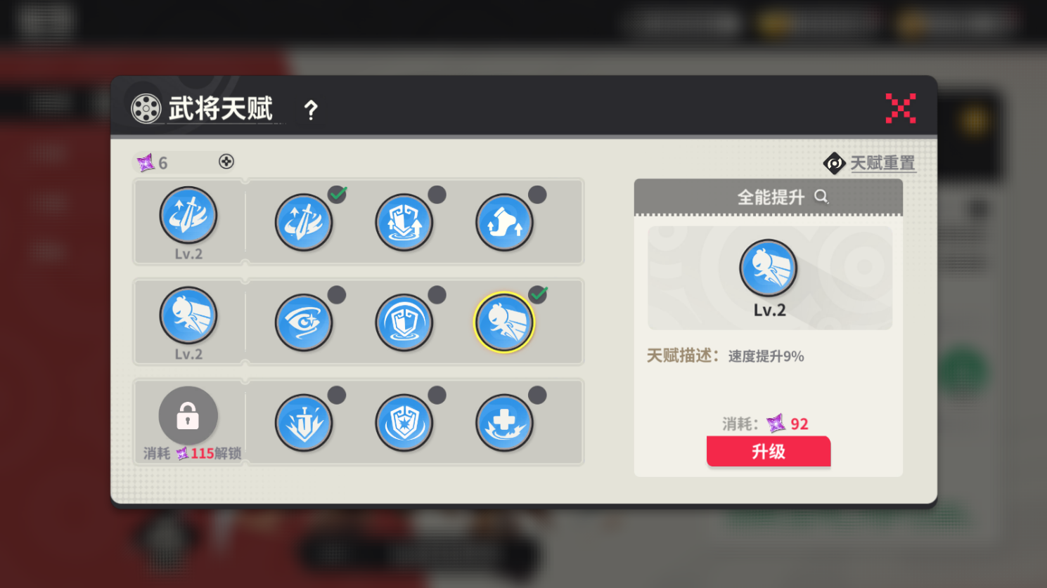 只有指定擁有武將天賦,根據武將星級解鎖武將天賦階級;每個天賦階級擁有3個技能,通過消耗道具提升天賦技能等級;天賦等級越高,增加的技能效果,技能屬性越高。