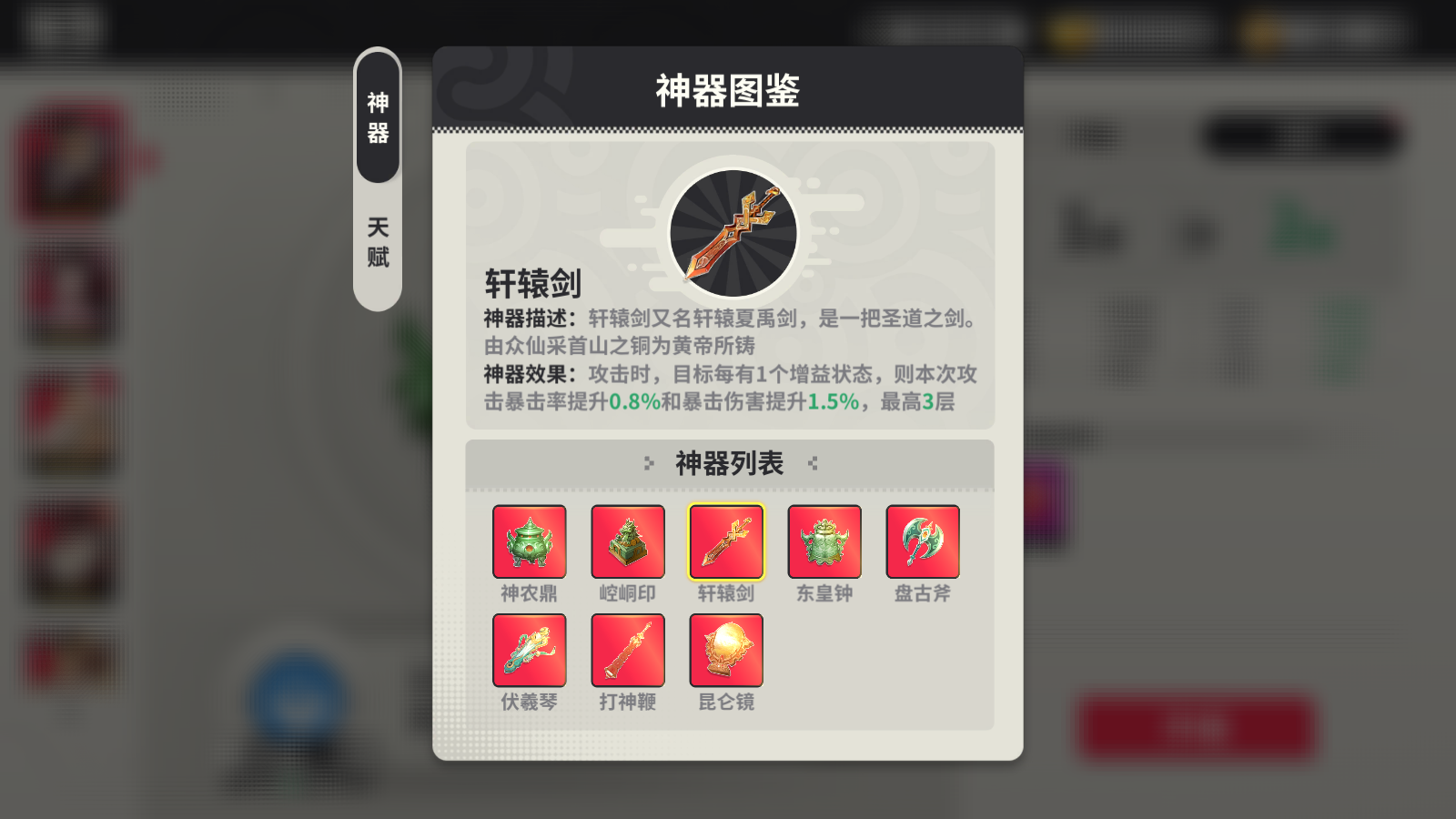 游戲內有八個不同的神器,每個神器提供的效果都不一樣,主公可根據自身陣容選擇搭配,神器會佩戴天賦技能,可通過重鑄改變神器的天賦技能。